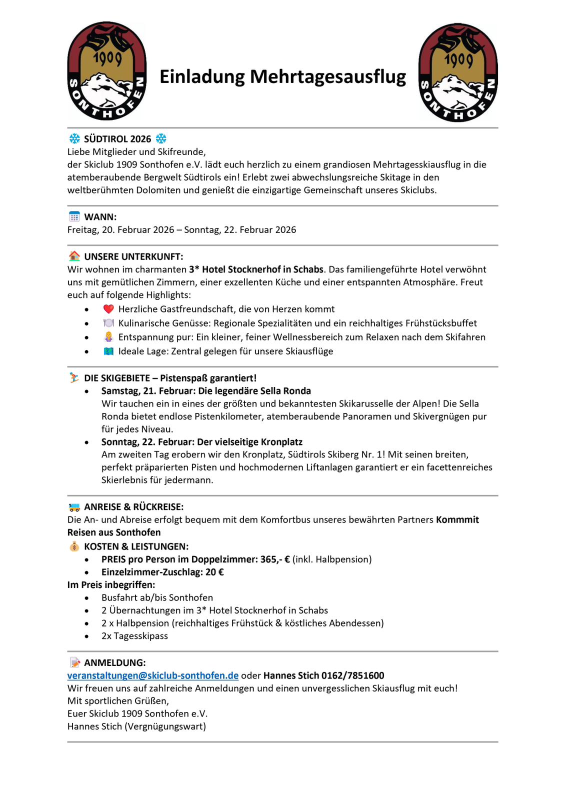 Mehrtagesskiausflug Südtirol vom 20.02 - 22.02.2026