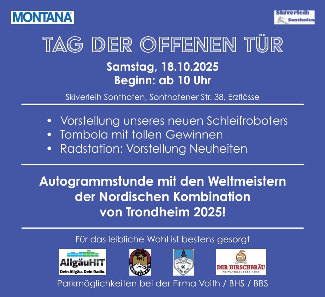 Am Samstag, den 18.10.2025, laden die Skiclubs Burgberg und Sonthofen zum Tag der offenen Tür beim Skiverleih Sonthofen ein! Beginn ist um 10:00 Uhr und es erwartet euch ein spannendes und abwechslungsreiches Rahmenprogramm!